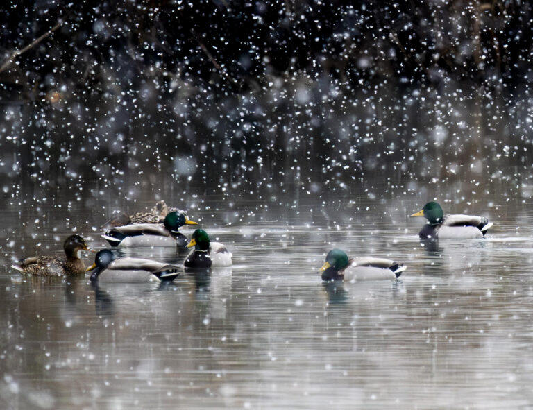 厳寒の早朝、大粒の牡丹雪が降る中、