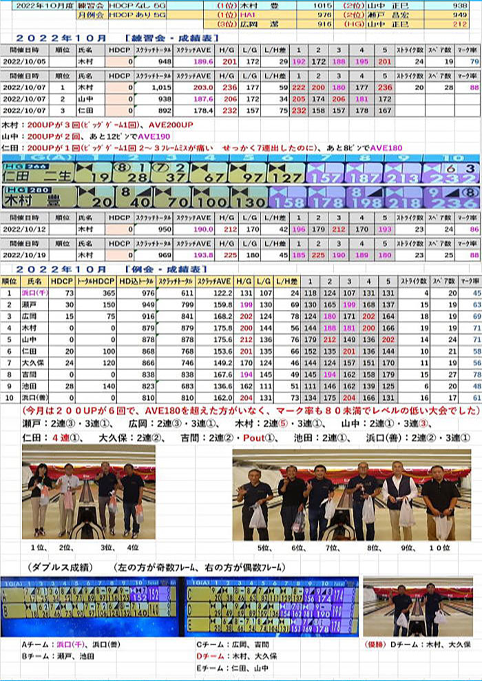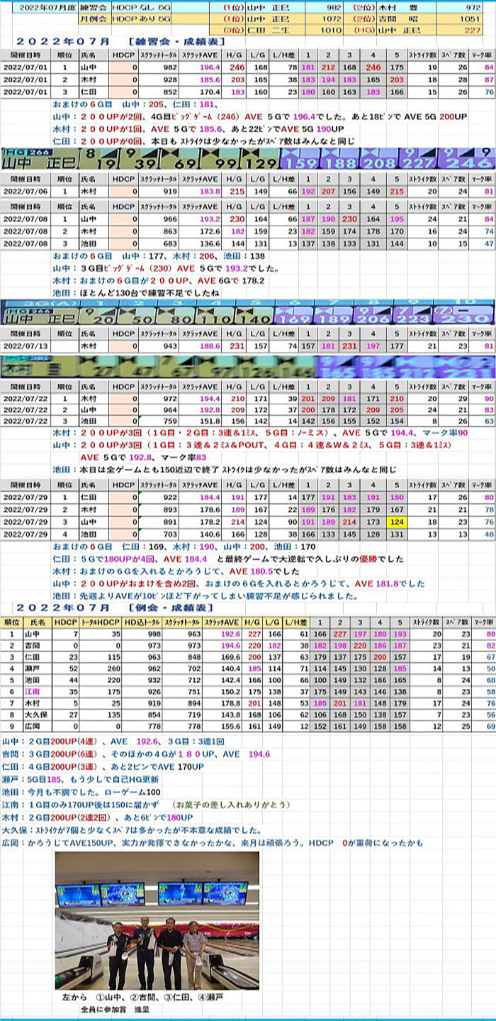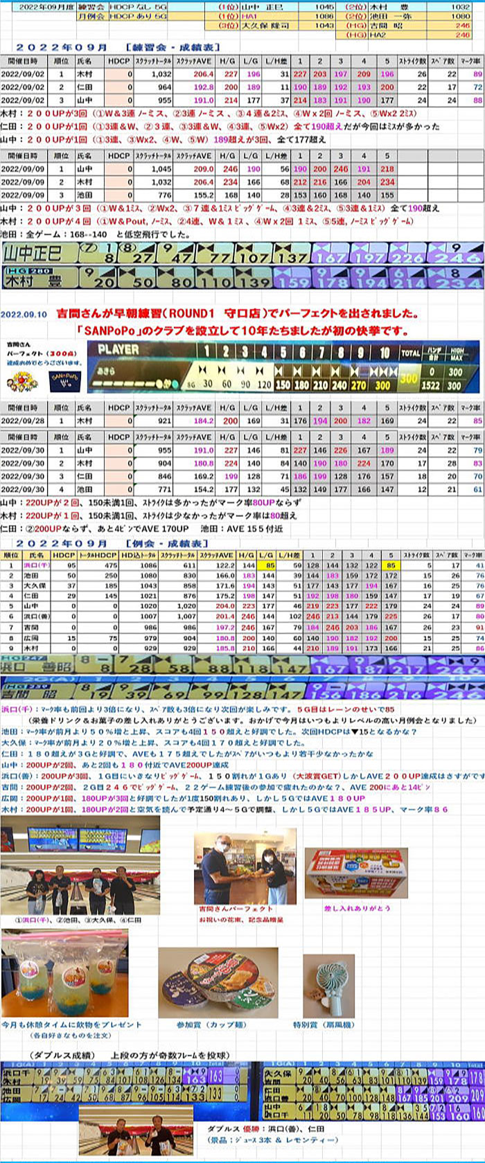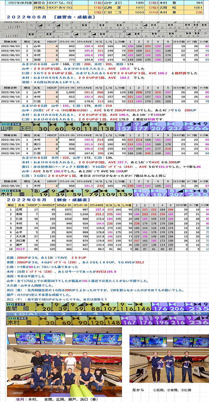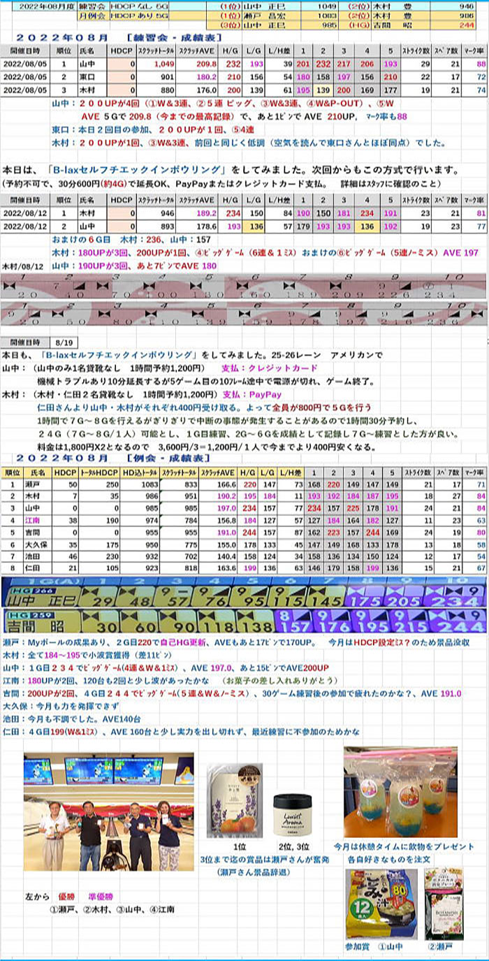 | 練習方法 | アメリカン方式で行います。(1フレ-ム毎にレーンチェンジ) 毎月の成績を集計しHDCPを3ヵ月毎に設定 |