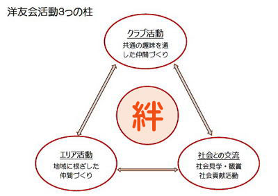 そのような中、洋友会設立以来クラブ活動を本体として展開し、現在13のクラブに延べ400人の方が参加されています。そのための活動の幅を上図のように、